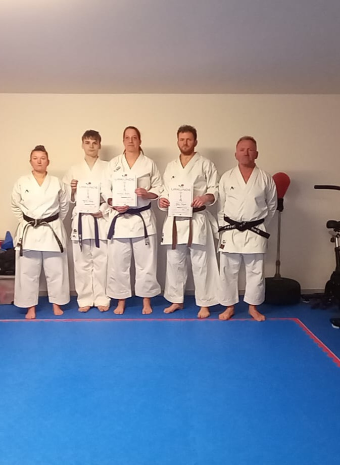 Die Kyu-Prüfung gliederte sich in einen theoretischen sowie in einen praktischen Teil. Den Auftakt bildete eine schriftliche Aufgabe, die im Vorfeld bearbeitet und innerhalb einer kurzen Zeit abgegeben werden musste. Dabei setzten sich die Prüflinge mit zentralen Fragen auseinander, wie zum Beispiel „Was verstehst du unter Karate?“ oder „Was ist dir im Training wichtig“.