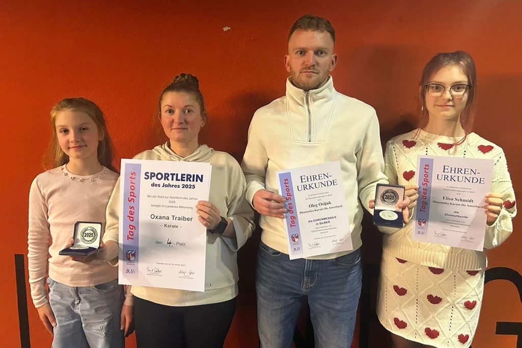 Zu den geehrten Sportlerinnen und Sportler gehörten erstmals auch mehrere unserer Karateka – sehr zur Freude aller! Oleg Osijuk erhielt für seine Erfolge die Ehrenmedaille in Silber. Geehrt wurde auch Elisa Schmidt. Für ihre Leistungen erhielt sie die Ehrenurkunde. Auch unsere Cheftrainerin Oxana Traiber wurde an diesem Abend bei den Auszeichnungen bedacht. Bei der Wahl zur Sportlerin des Jahres 2025 belegte sie einen fantastischen 4. Platz.